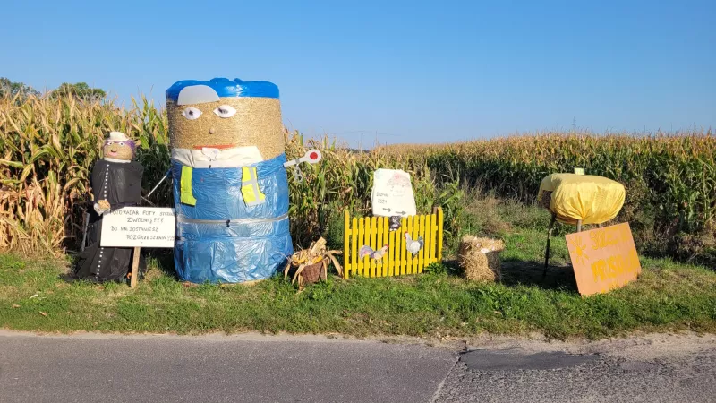 Odkryj witacz dożynkowy "Pruska Łąka" w gminie Kowalewo Pomorskie, ozdobiony symbolami rolnictwa.