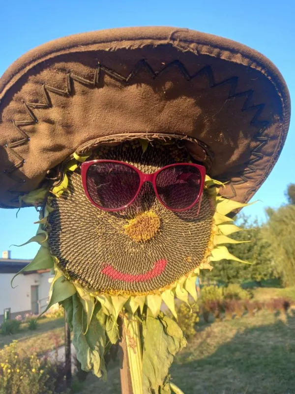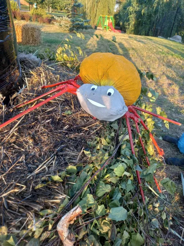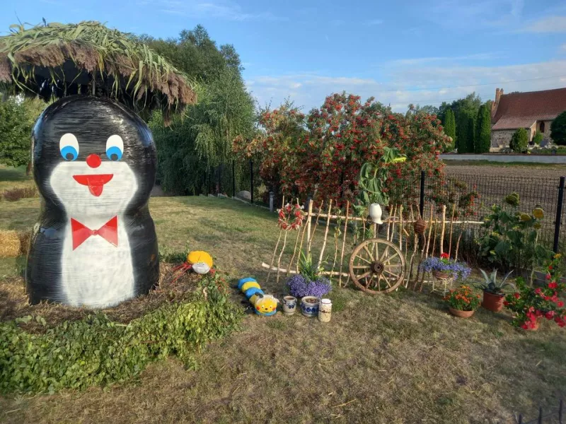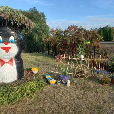Odkryj witacz dożynkowy "Srebrniki" w gminie Kowalewo Pomorskie, ozdobiony symbolami rolnictwa.