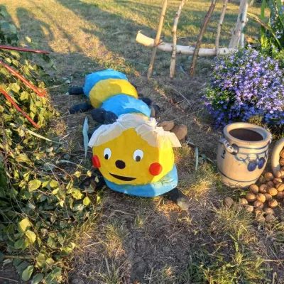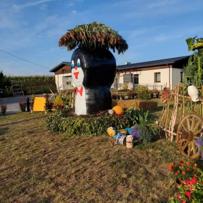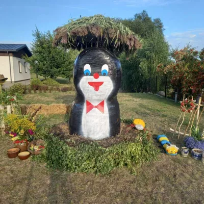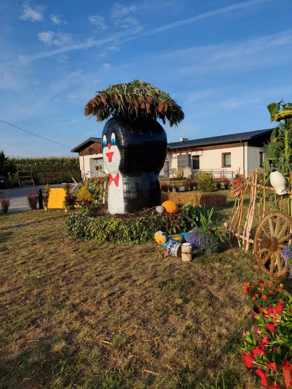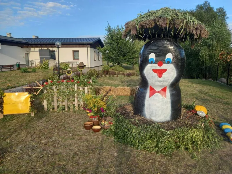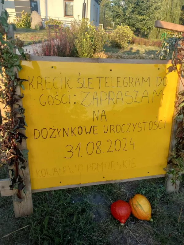 Odkryj witacz dożynkowy "Srebrniki" w gminie Kowalewo Pomorskie, ozdobiony symbolami rolnictwa.