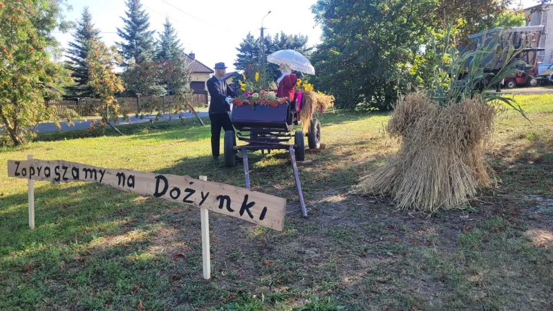 Odkryj witacz dożynkowy "Wielkie Rychnowo" w gminie Kowalewo Pomorskie, ozdobiony symbolami rolnictwa.